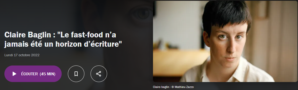 Ce matin, dans Totémic, une écrivaine qui vient de publier son premier roman : Claire Baglin. Elle a 24 ans et son livre s’intitule En salle. Elle y fait notamment le récit de son expérience d’employée dans la restauration rapide. Un sujet pas souvent traité dans la littérature française.