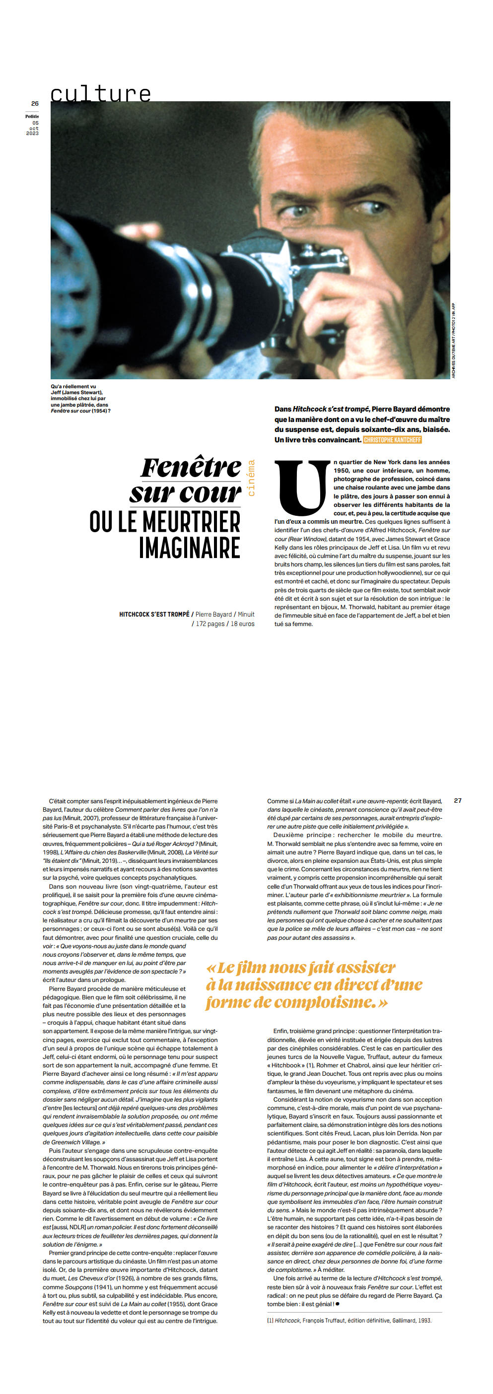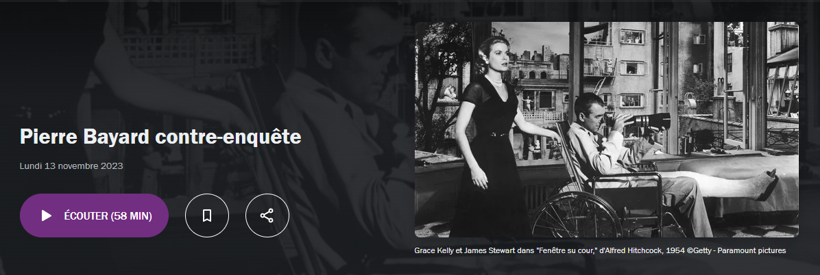L’auteur a raison de qualifier son roman de policier car il a l’art de manigancer différents suspens et de faire rebondir son action dans les marges de la psychanalyse et de la philosophie quand elle menace de mollir. Le tout emballé par un humour délicat, qui distancie tout autant la mise en scène de son entreprise que notre délectation à la lire. Pour preuve, une citation inaugurale d’Hitchcock lui-même : “On critique la nullité de la police, mais que Dieu nous protège des brillants détectives amateurs !” Amateur, Pierre Bayard ? Certes oui, mais du genre amoureux, tant son récit est gorgé d’une connaissance encyclopédique et d’une admiration sans borne pour l’œuvre d’Hitchcock. Et détective tout aussi sûrement, farfouillant dans tous les recoins de Fenêtre sur cour pour en extraire un gigantesque bonus-malus, parfois délicieusement zinzin quand à sa fenêtre de romancier il est à son tour saisi par “l’euphorie de l’interprétation” ; mais plus grave qu’il n’y paraît lorsqu’à l’occasion de sa dissection de la paranoïa qui fait carburer tous les personnages du film surgit une réflexion d’actualité sur les diverses crédulités collectives dont nous sommes capables à l’heure du complotisme généralisé.