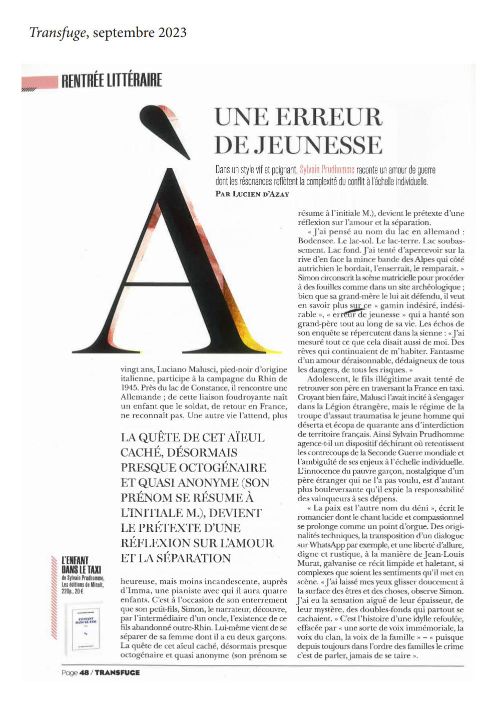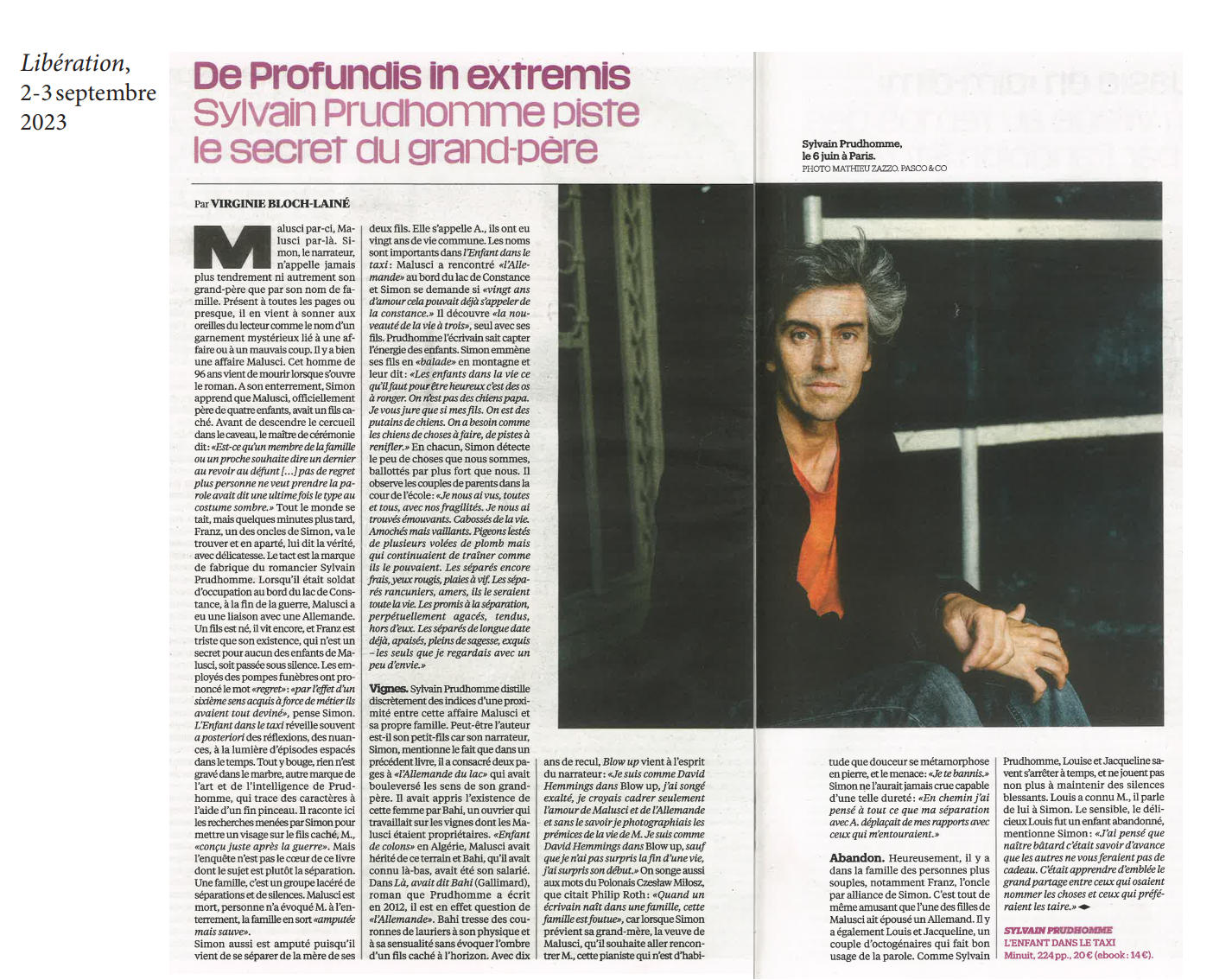 Comme le meurtrier photographié au second plan dans Blow up, le film d'Antonioni (1966), le secret était là, en évidence, entre les pages d'un roman déjà écrit. En 2012, Sylvain Prudhomme publiait Là, avait dit Bahi, le récit d'un vieil Algérien qui, au volant de son camion, racontait sa vie d'ouvrier agricole sous la colonisation française au jeune bomme qu'il avait pris en stop. C'est là que, pour la première fois, le narrateur avait entendu parler de l'Allemande du lac de Constance, un amour de jeunesse de son grand-père, Malusci, membre des forces françaises d'occupation en Allemagne. Une décennie plus tard, Sylvain Prudhomme fait de cette histoire le motif prinipal de L'Enfant dans le taxi, son roman le plus clairement autobiographique.