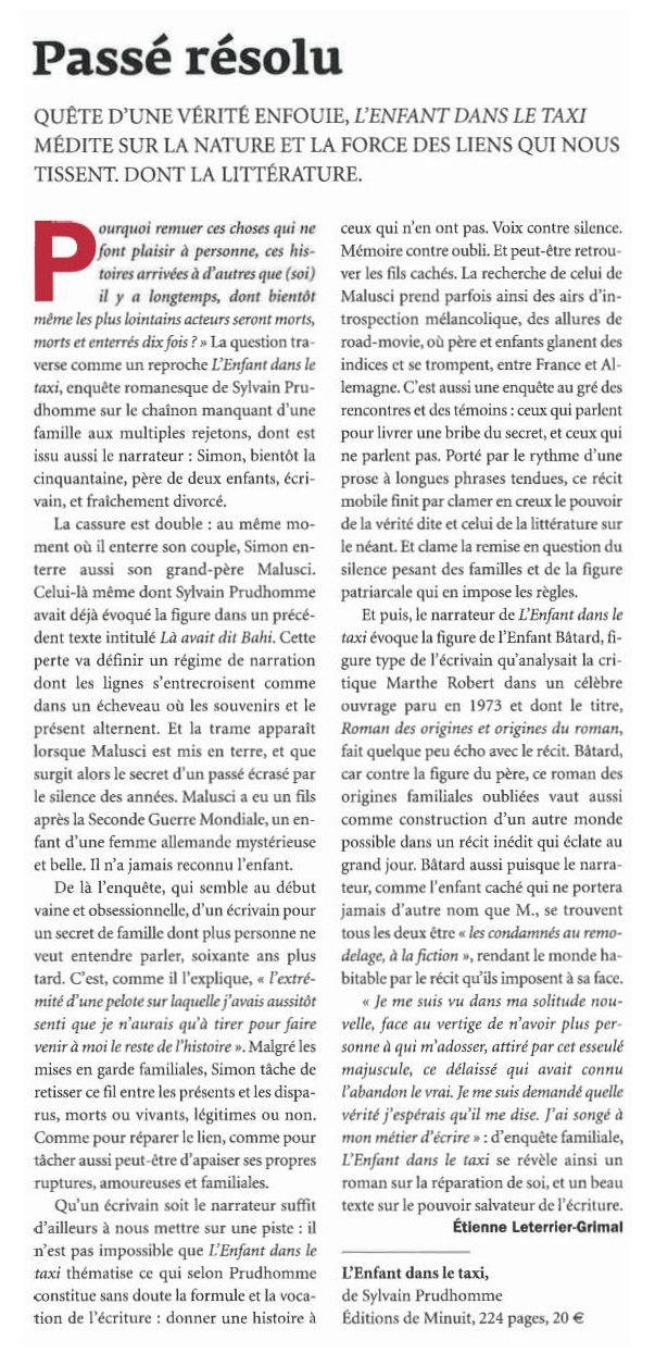 C'était une des leçons de "Par les routes", ce très beau roman qui n'avait pas la prétention d'en donner, et qui a valu le prix Femina 2019 à Sylvain Prudhomme : "Le monde se divise en deux catégories. Ceux qui partent. Et ceux qui restent." Ce pourrait être une des clés de "L'Enfant dans le taxi", qui démarre pour Simon par cette révélation lors d'un enterrement : "Tu es au courant n'est-ce pas que ton grand-père a eu un fils en Allemange à l'époque où il était soldat d'occupation au bord du lac de Constance." Simon, bien sûr, n'était pas au courant du tout, "puisque depuis toujours dans l'ordre des familles le crime c'est de parler, jamais de se taire". Il est tombé des nues. Il a voulu en savoir plus : sur le vieil amour de ce patriarche et d'une belle Allemande ; sur le fils qu'il a privé de père ; sur la loi du silence, ce ciment des tribus, qui a condamné l'inglorious bastard à n'être qu'une "erreur de jeunesse" ; sur les quelque "400 000 enfants allermands" qui, comme ce malheureux M., seraient "nés de soldats alliés" dans le sillage de la Seconde Guerre mondiale.