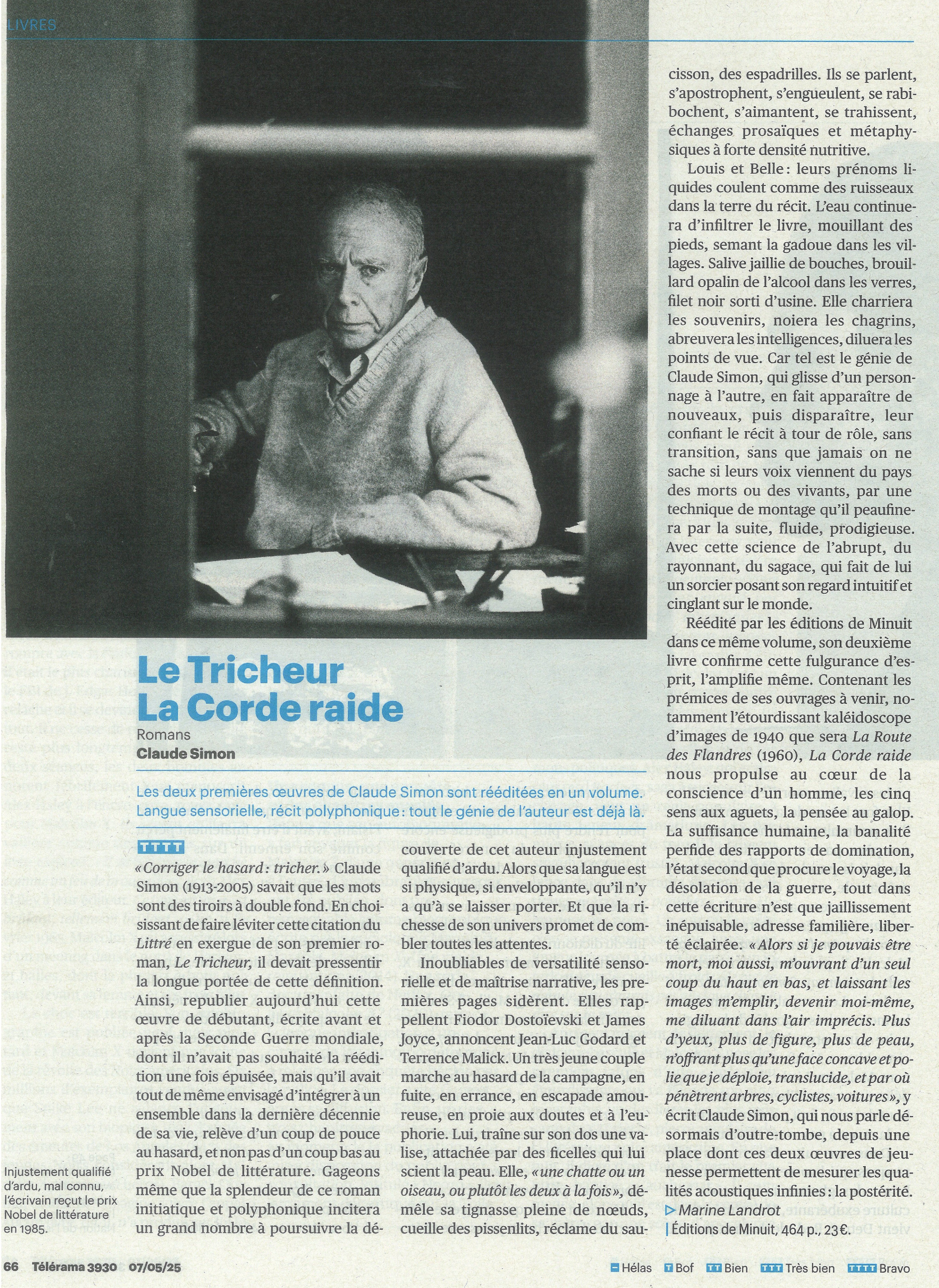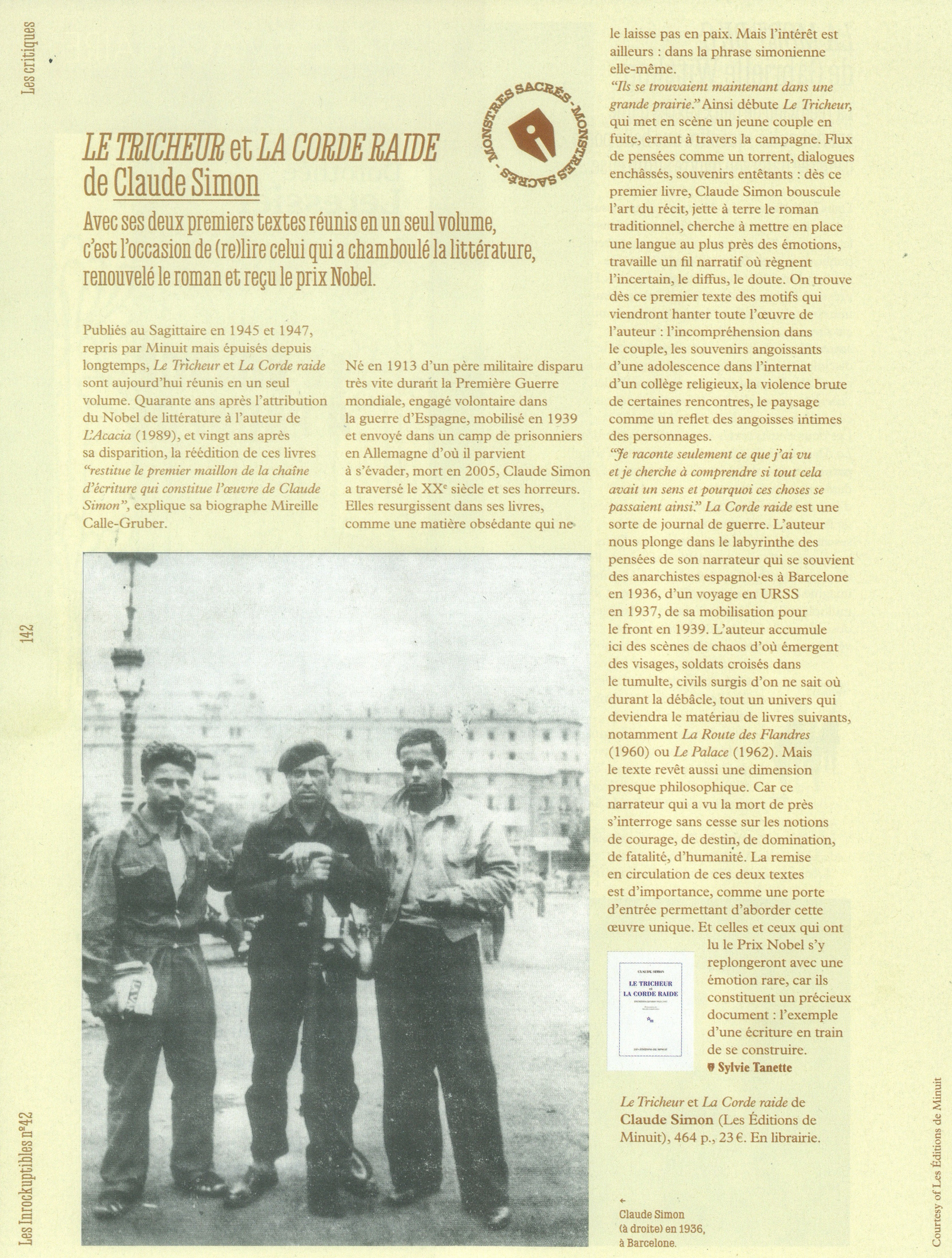 Publiés au Sagittaire en 1945 et 1947, soit une dizaine d’années avant Le Vent qu’il considérait comme sa véritable entrée en littérature, Le Tricheur et La Corde raide sont les deux premiers livres de Claude Simon.