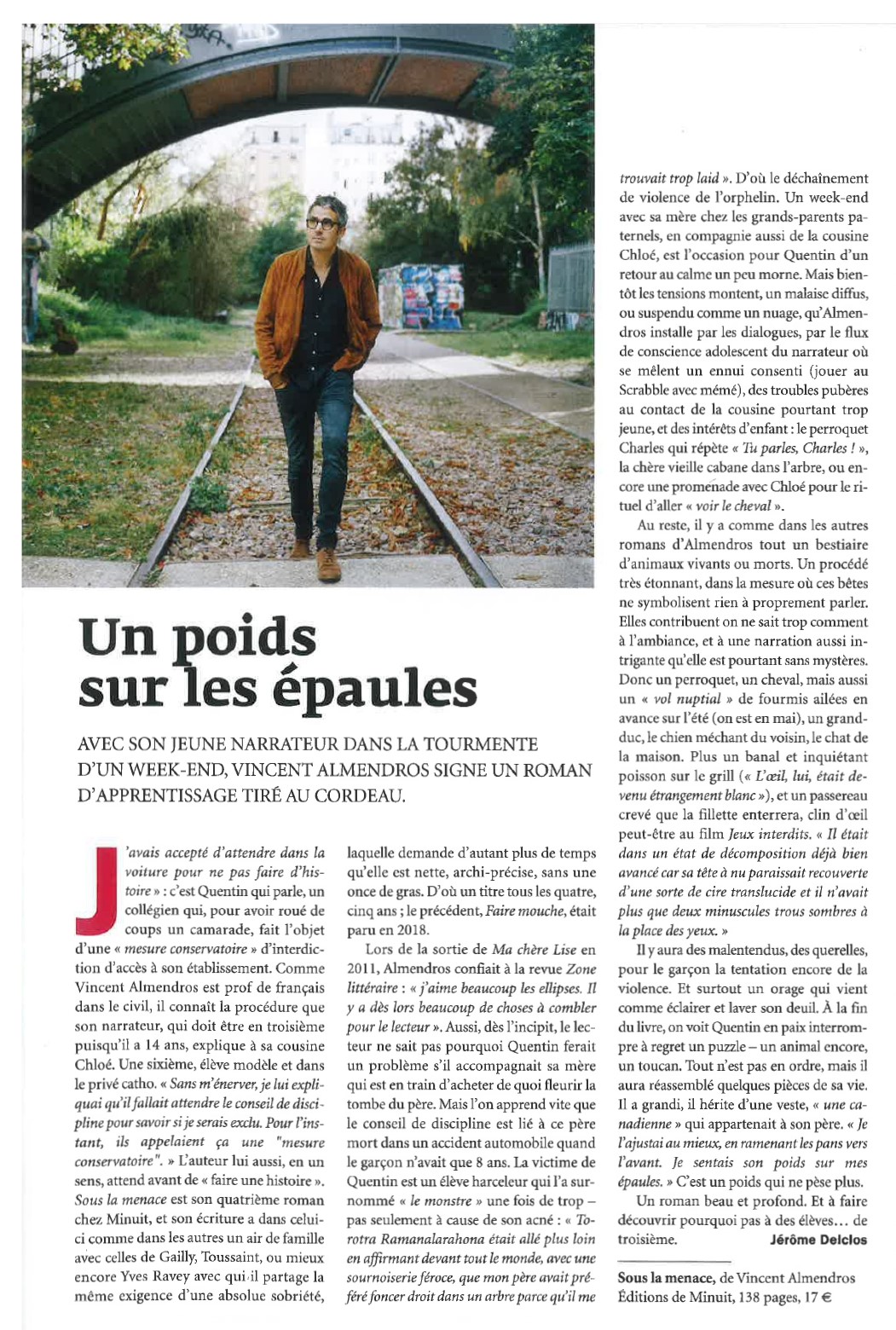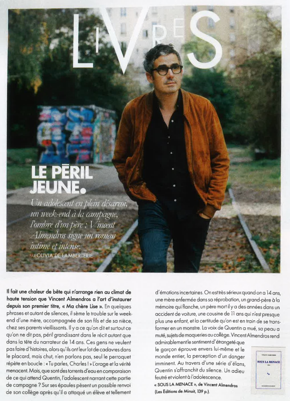 "Certaines écritures plus que d'autres savent y faire avec le mystère. C'est le cas de celle de Vincent Almendros, dont il faut toujours relire les textes deux fois pour être certain de n'avoir pas loupé un détail. Une deuxième lecture qui vous met souvent en appétit d'une troisième. L’écrivain publie Sous la menace, un nouveau roman aux éditions de Minuit, qui ausculte la période trouble de l'adolescence et quelques secrets de famille. Dans ce livre, comme dans les autres, on a l'impression que les mots avancent pareils à des agents doubles, tractant un texte secret sous le texte apparent." Marie Richeux
