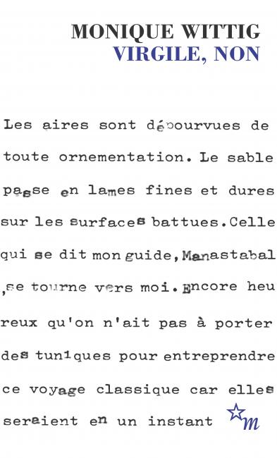 " Imaginez l’espace d’un film de Cocteau quand les personnages remontent le temps et se déplacent au ralenti, à cause de la force du vent. C’est dans un tel univers visuel que l’auteur de ce livre, devenu personnage à son tour, va et vient. Le lieu imaginé cependant n’a pas pour référence l’antiquité et les vieux murs mais le San Francisco moderne. C’est un San Francisco rendu utopique par la projection systématique d’un nulle part qui est soit l’enfer, soit les limbes, soit le paradis. Dans l’enfer souffle le vent et il est difficile d’avancer. Dans le paradis on tombe sans crier gare. Quant aux limbes c’est là où on va boire un coup. On, c’est-à-dire Wittig et Manastabal, un guide qui est loin d’avoir la douceur du Virgile de Dante, protagonistes d’un opéra des gueuses à la fois féroce et gai et qui comme la comédie de Dante finit bien. Il y a une providence, il y a des anges en chair et en os, il y a des monstres, il y a l’Achéron, il y a les horreurs de l’enfer et les délices du paradis. " M.W.