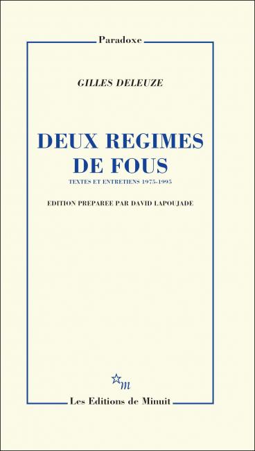 De ce point de vue, le deuxième tome des “ Textes et Entretiens ” (1975-1995), Deux régimes de fous, apporte plus encore que le premier (L’Ile déserte et autres textes (1953-1974), Éditions de Minuit). Il y a, bien sûr, à nouveau le plaisir de retrouver certains textes difficiles d’accès : les textes politiques d’abord (sur Toni Negri, sur la Palestine, sur mai 68 et l’effervescence de l’Université de Vincennes) ; le pamphlet contre les nouveaux philosophes ; la conférence à la FEMIS (« Qu’est-ce que l’acte de création ? ») ; mais aussi toutes les étapes du dialogue si riche engagé avec Michel Foucault (dont les notes prises sur Surveiller et punir, document exceptionnel pour comprendre la divergence des vues entre les deux auteurs sur la question du désir et du pouvoir). Mais il y a également tous ces moments où transparaît la maturité, le regard sans complaisance sur l’œuvre : “ Ici, mon idée c’était… ” ; “ là, nous avons créé le concept… ” ; “ si c’était à refaire, je m’y prendrais plutôt comme ça… ”.