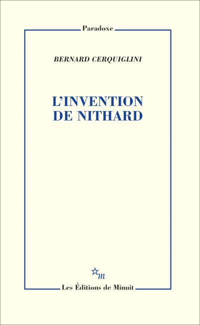 « A peine issue du latin, au IXe siècle, la langue française fut écrite, dans un contexte éminent et à des fins politiques (Serments de Strasbourg, 842) ; c’est singulièrement tôt. Un petit-fils de Charlemagne, prince diplomate, guerrier latiniste, eut l’idée de son usage écrit ; Nithard est l’inventeur de la langue française. » Texte à l’appui, Cerquiglini en fait le premier « écrivain d’une littérature née de son chagrin ». Il prétend ainsi, en véritable écrivain qu’il est lui-même, réparer l’ingratitude des siècles : « Au terme d‘un road-movie carolingien, le lecteur saura pourquoi. »