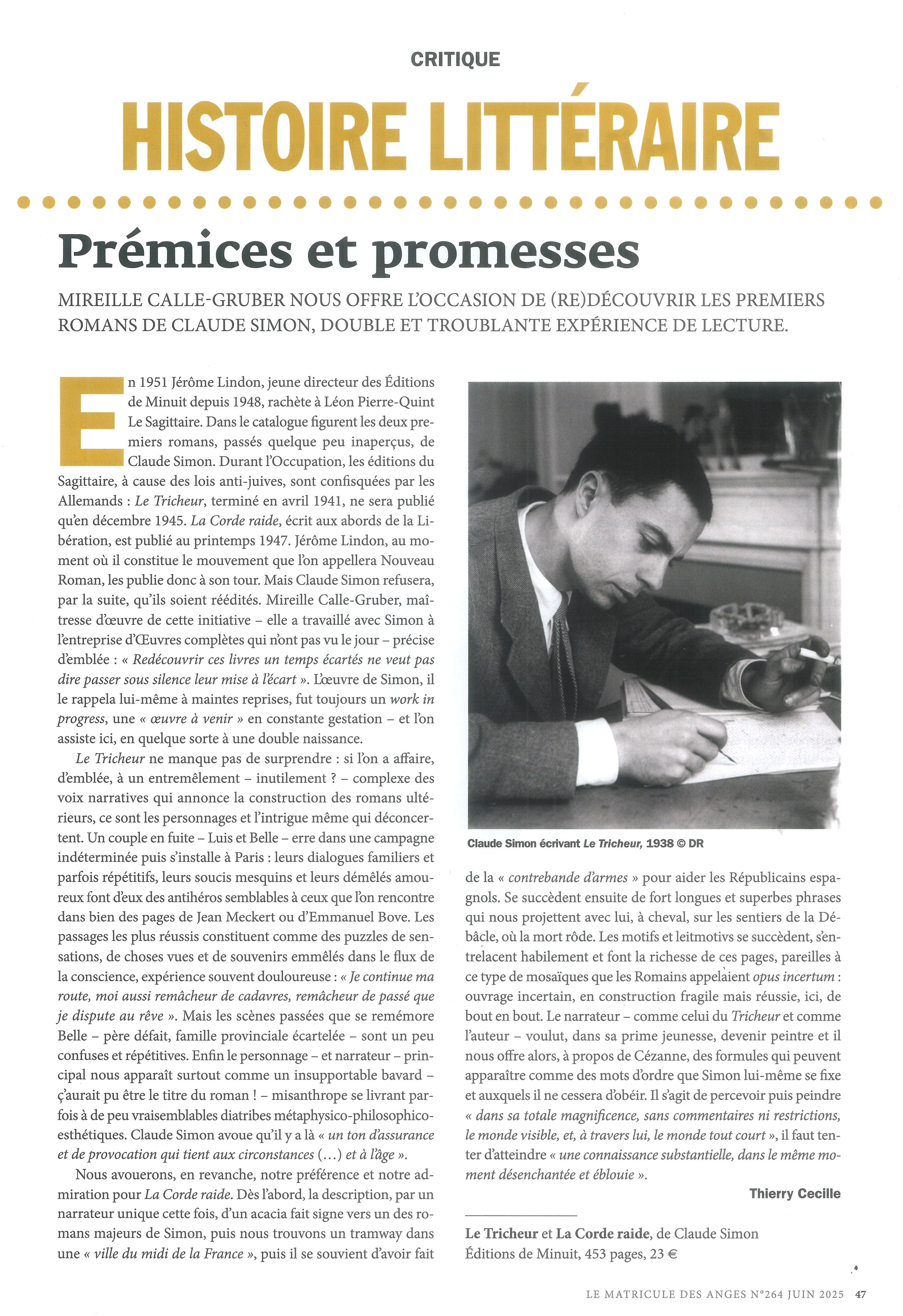Publiés au Sagittaire en 1945 et 1947, soit une dizaine d’années avant Le Vent qu’il considérait comme sa véritable entrée en littérature, Le Tricheur et La Corde raide sont les deux premiers livres de Claude Simon.
