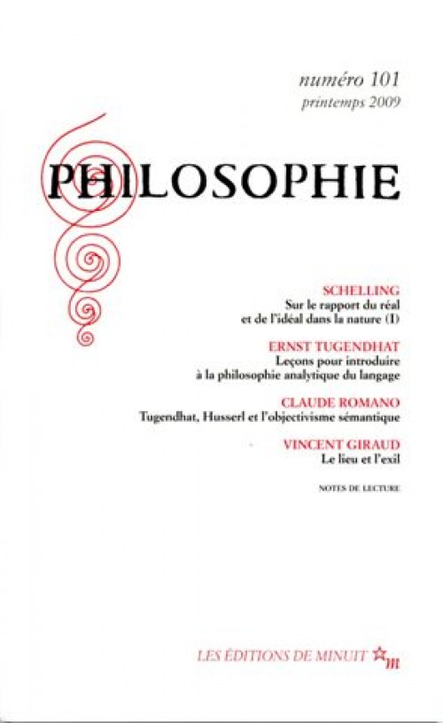SCHELLING, Sur le rapport du real et de l’idéal dans la nature (I). Présenté par Mildred Galland-Szymkowiak - ERNST TUGENDHAT, Leçons pour une introduction à la philosophie analytique du langage - CLAUDE ROMANO, Tugendhat, Husserl et l’objectivisme sémantique - VINCENT GIRAUD,