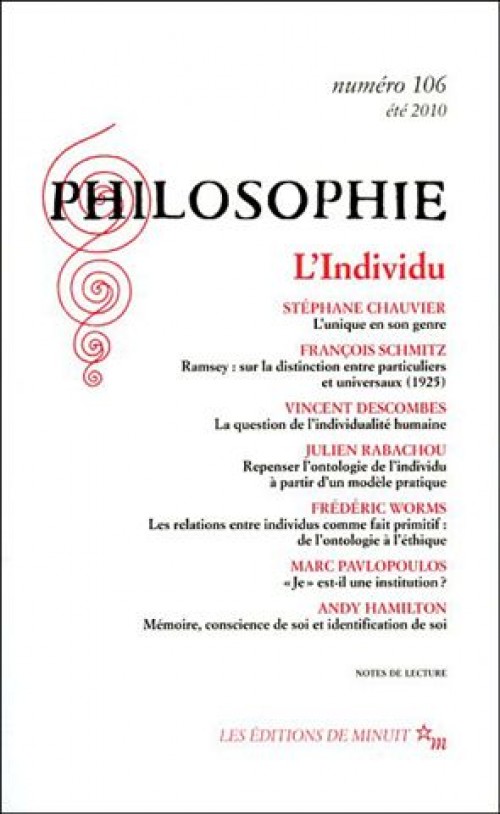 La question se complique lorsqu'on la restreint au domaine de l'individualité humaine : est-il possible de penser la singularité d'un individu humain à partir des instruments conceptuels qui ont permis de caractériser celle de l'étant en général (catégories et principes d'individuation), ou bien l'individualité humaine est-elle sui generis et requiert-elle une conceptualité nouvelle ? Ainsi, Julien Rabachou examine la pertinence de modèles ontologiques traditionnels pour penser l'individu humain. Et, partant de la thèse heideggerienne qui distingue l'identité ontologique d'un étant quelconque (Selbigkeit) et l'ipséité d'un être humain (Selbstheit) – alors que l'identité à soi-même d'une chose de la nature est simplement ce qui fait d'elle cette chose, l'ipséité relève de la manière d'être vis-à-vis de soi-même ou de choisir entre être soi-même ou non –, Vincent Descombes s'attache à dégager la confusion grammaticale qui grève implicitement l'analyse heideggerienne : la confusion entre le quis et le quid, l'identification d'un individu et la caractérisation de ses actes. De même, Frédéric Worms réinterroge le rapport entre individu et relation, en se demandant si les relations interindividuelles sont ou non constitutives de l'individualité – ce qui conduit de l'ontologie à l'éthique. Enfin, Marc Pavlopoulos et Andy Hamilton repensent l'individuation humaine à partir de l'expérience interne : quel type d'expérience me permet d'avoir accès à mon Soi et de fixer mon ipséité ?