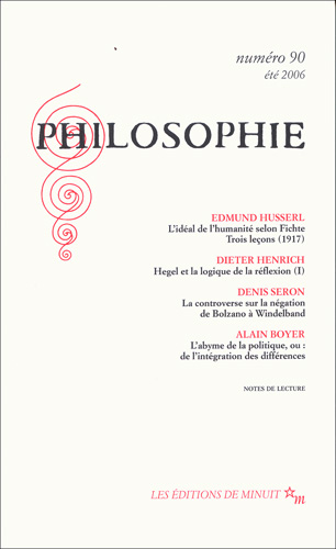 Dans " La controverse sur la négation de Bolzano à Windelband ", D. Seron s'attache au " problème de la négation ", qui a traversé la philosophie germanique du XIXème et de la première moitié du XXème siècle, et se définit par un ensemble de questions fondamentales : l'affirmation et la négation sont-elles co-originaires, ou l'une se laisse-t-elle dériver de l'autre ? la négation est-elle assimilable à l'acte de nier ou appartient-elle au contenu sémantique idéal visé par cet acte ? si la négation est un acte de rejet, que rejette-t-elle ? s'identifie-t-elle à une diairesis, et implique-t-elle une synthesis entre contenus de représentation ? D. Seron retrace l'histoire de ce problème qui, ancrée dans la Logique de Lotze et la Doctrine de la science de Bolzano, conduit à Husserl et Frege.