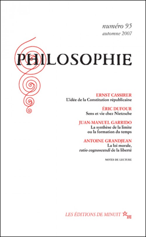 La loi morale, ratio cognoscendi de la liberté d’A. Grandjean est consacré à la pensée pratique de Kant et étudie la preuve de la réalité de la liberté présentée dans la Critique de la raison pratique. À cette fin, il analyse le concept kantien de ratio cognoscendi pour montrer que l’assimilation de la loi morale à la ratio cognoscendi de la liberté fonde une connaissance indirecte de cette dernière : la liberté transcendantale est prouvée de manière apagogique, à partir du fait qu’elle conditionne – celui de la loi morale. Il confirme cette interprétation par l’analyse précise des paragraphes 5 et 6 du chapitre premier de l’ Analytique de la raison pratique pure , montrant que le renvoi réciproque de la loi morale à la liberté ne vaut en fait que de la première à la seconde, et non en sens inverse.