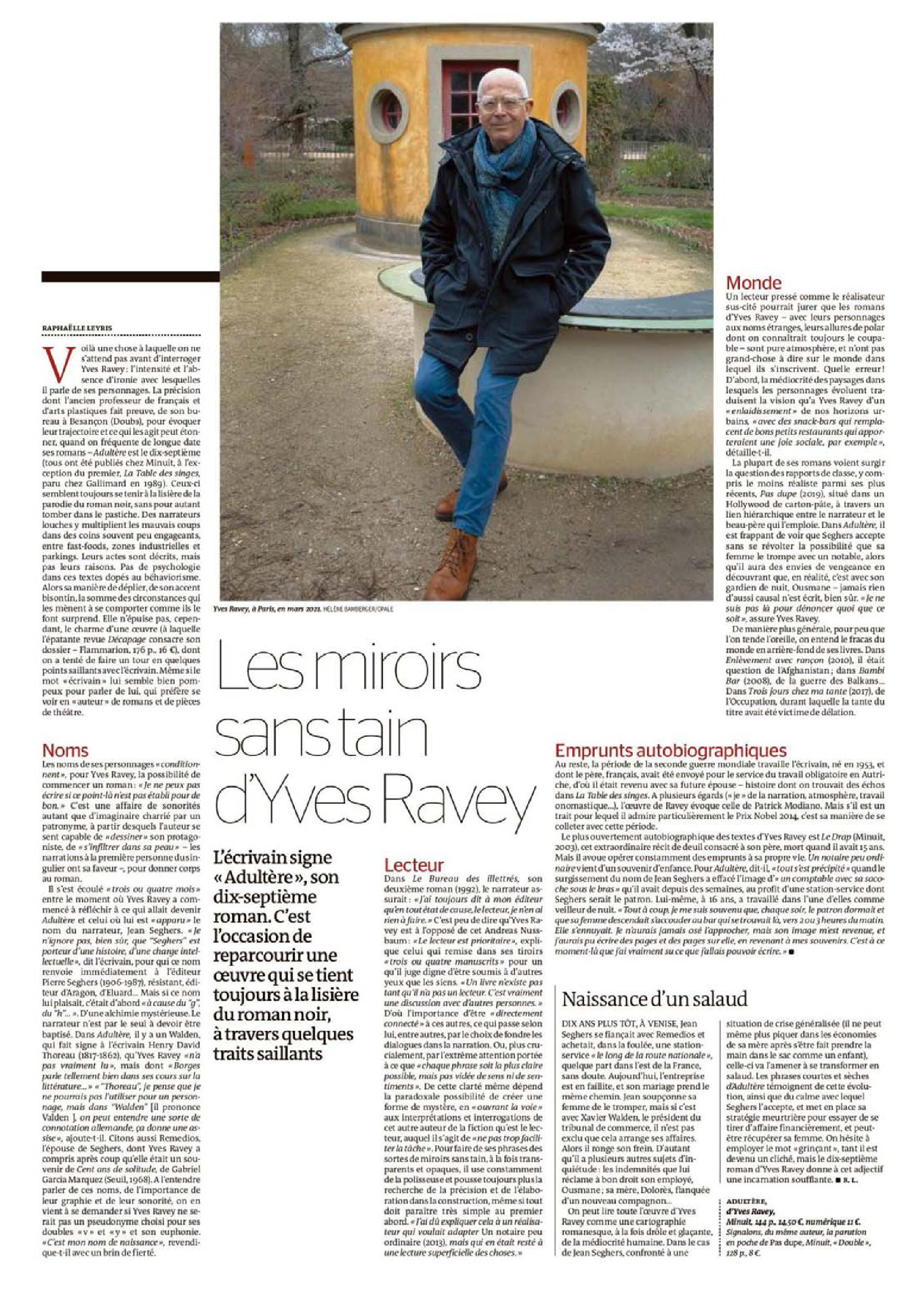 Remedios, Dolorès, Salazare, Walden, Hunter : les noms, chez Ravey, collent au personnage par une alchimie secrète, évidente pour lui. Pourquoi prêter aux deux femmes des attributs de madones ? « Je ne sais pas, je dirais que c’est la rédemption, si ce n’était pas un trop grand mot. Pour Remedios, je me suis souvenu après coup que c’est une figure qui revient sur plusieurs générations dans Cent Ans de solitude. A la fin, elle secoue des draps et s’envole avec eux dans le ciel. J’y ai repensé quand, dans Adultère, quelqu’un se tient face à un incendie et un appel d’air fait vibrer sa chemise. Cette vibration exerce un effet de magie. » Un peu du réalisme magique de Gabriel Garcia Marquez chez Ravey ? C’est surprenant, comme l’est la scène finale, troublante, obéissant à la logique grammaticale plus qu’à celle des sentiments.