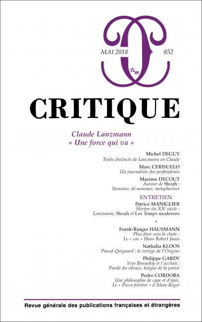 Alors que vient de paraître, sous la direction de Juliette Simont, un volume qui lui rend hommage, Critique a souhaité saluer cette œuvre de vie dont la ligne de crête court de Shoah au Lièvre de Patagonie sans s’y résumer. Nous donnons ici la parole à plusieurs de ses lecteurs parmi les plus attentifs. Maxime Decout rend compte de l’essai qu’Éric Marty a récemment consacré à Shoah. Marc Cerisuelo relit pour nous Le Lièvre de Patagonie. Le philosophe Patrice Maniglier nous parle de l’homme, de l’œuvre et de la revue à laquelle il est lui-même désormais associé : Les Temps modernes, consœur légèrement aînée de Critique. Michel Deguy, vivant trait d’union entre les deux revues, ouvre la marche avec un portrait sensible de « Lanzmann en Claude ».